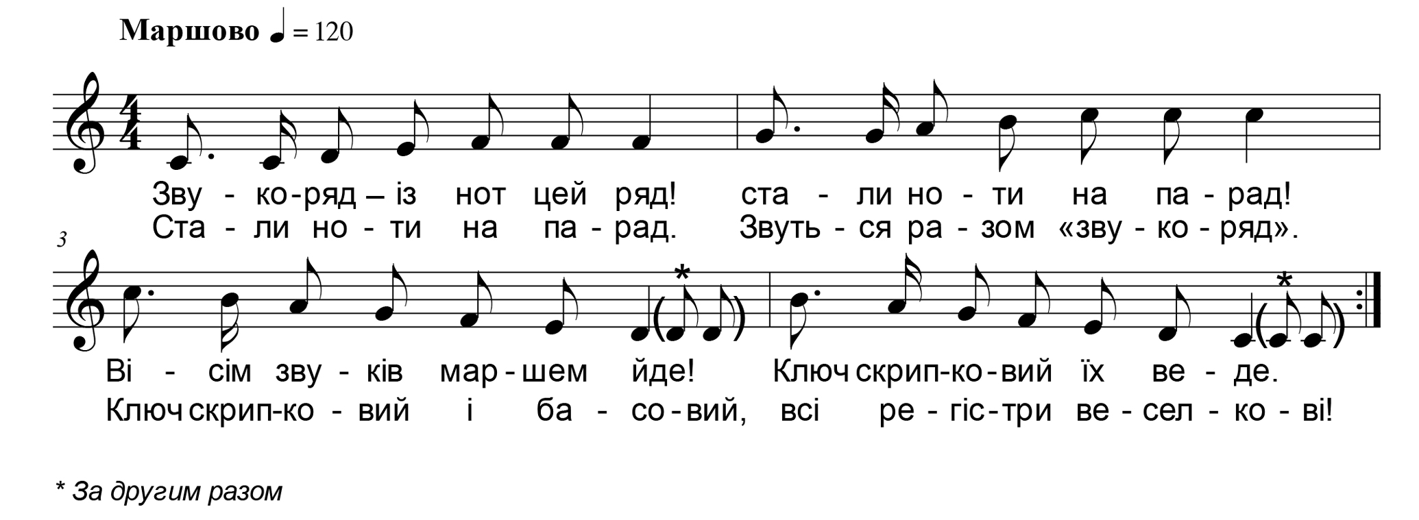 Звукоряд — із нот цей ряд! Стали ноти на парад! Вісім звуків маршем йде! Ключ скрипковий їх веде. Стали ноти на парад. Звуться разом “звукоряд”. Ключ скрипковий і басовий, Всі регістри веселкові!