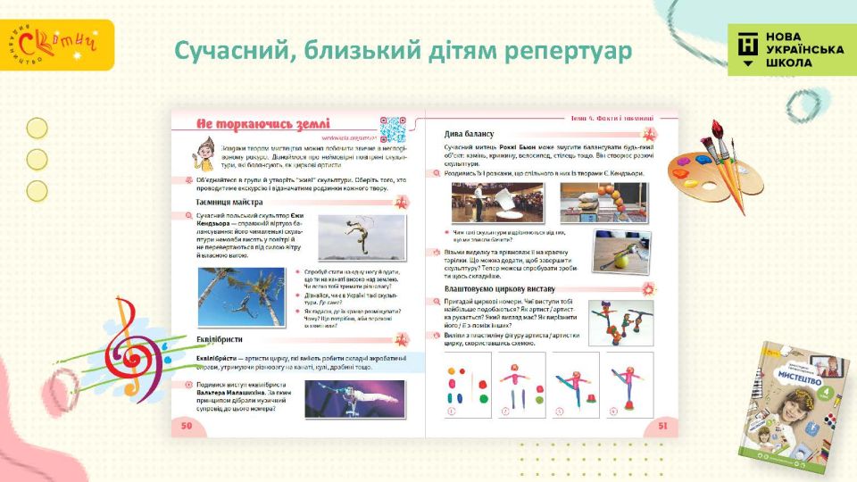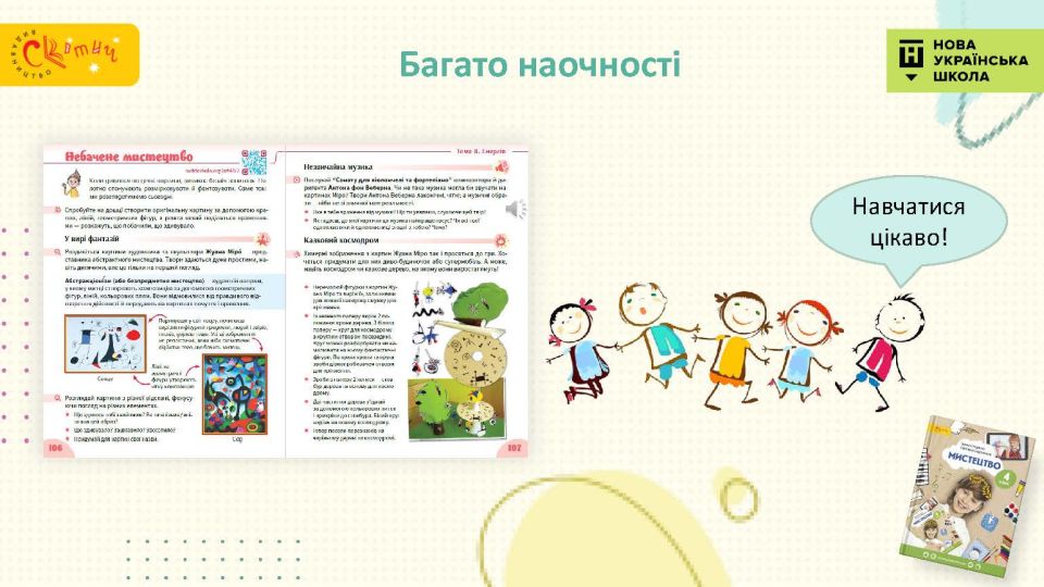 - Сучасний підручник для сучасної дитини — використовуємо як класичні, так і сучасні твори мистецтва, діти у творах живопису впізнають себе.