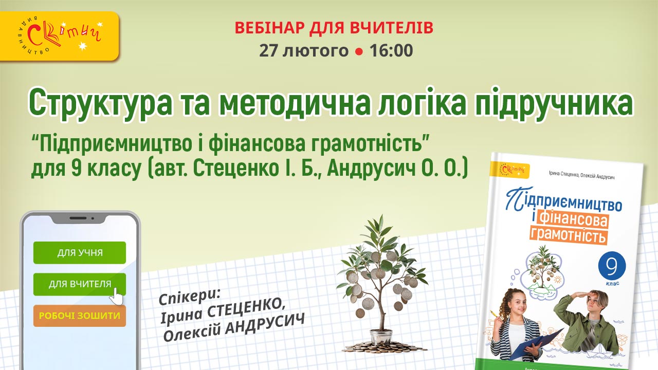 Підручник “Підприємництво і фінансова грамотність” для 9 класу (авт. Стеценко І. Б., Андрусич О. О.) спирається на знання і вміння, здобуті учнями на уроках інтегрованого курсу “Здоров’я, безпека та добробут” у 5-8 класах і предмету “Підприємництво і фінансова грамотність” у 8 класі.
