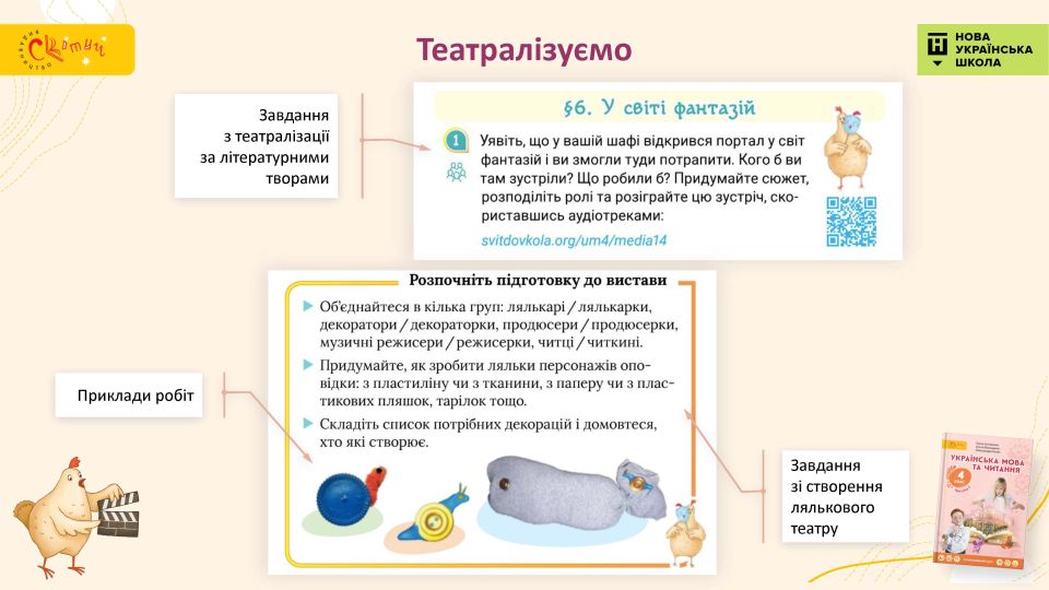 На уроках учням пропонуються окремі завдання на інсценування творів, моделювання ситуацій спілкування тощо. Але крім того, персонаж Режисерка щомісяця запрошує четвертокласників до рубрики “Наш театр”. Діти навчаються готувати та проводити різні вистави: драматичні, музичні, лялькові (з ляльками різних видів), а також театру пантоміми та театру тіней. І це не просто розвага, а діяльність, яка забезпечує розвиток наскрізних умінь учнів початкової школи, закріплених у Державному стандарті.
