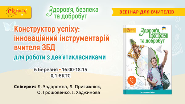 - Секрети методичної “кухні”: як вчителеві працювати з компетентнісно орієнтованим підручником “Здоров’я, безпека та добробут” (авт. Задорожна Л. В. та ін.) у 9 класі.