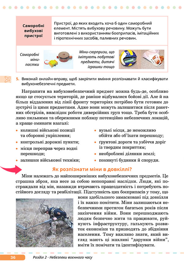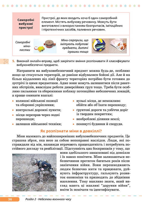 - знає, що таке вибухонебезпечні предмети, їх основні види та чому вони становлять загрозу;