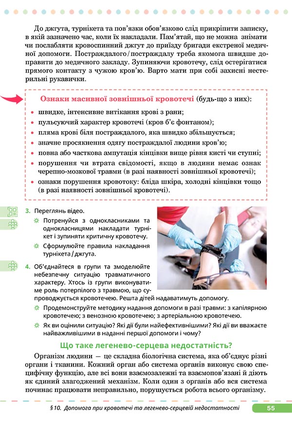 — Виконайте завдання 4 на сторінці 55 підручника. Об’єднайтеся в групи та змоделюйте небезпечну ситуацію травматичного характеру. Хтось виконуватиме роль потерпілого з травмою, що супроводжується кровотечею, решта — надаватиме допомогу.