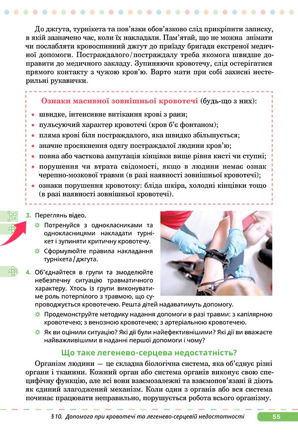 — Прочитайте про ознаки масивної кровотечі на сторінці 55 підручника (див. роздруківку “Кровотечі”).