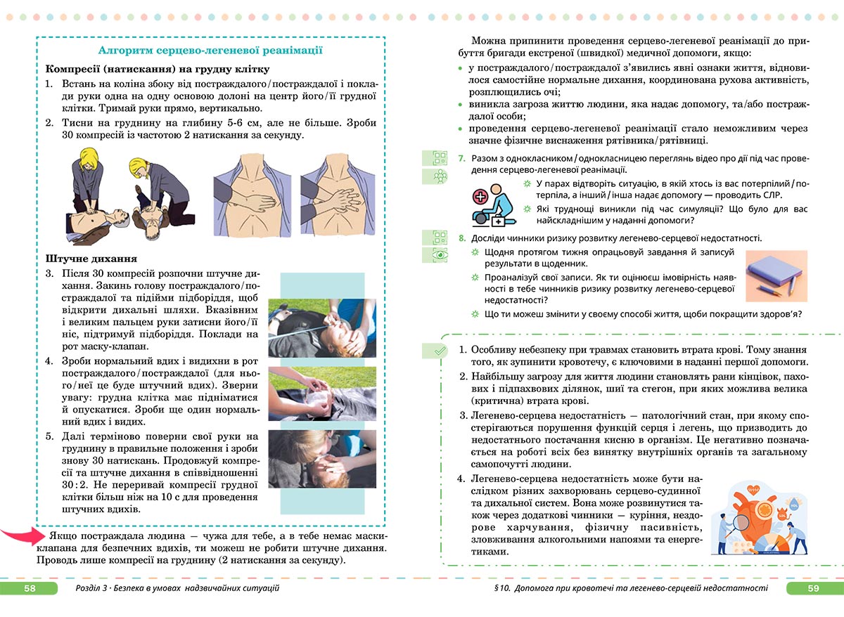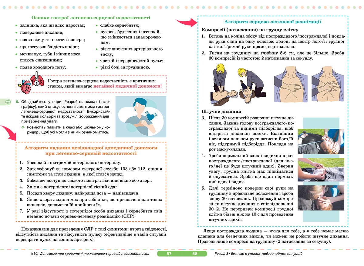Опрацюйте алгоритм надання невідкладної домедичної допомоги при легенево-серцевій недостатності та алгоритм серцево-легеневої реанімації на сторінках 57-58 підручника.