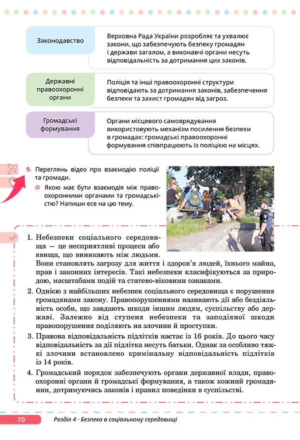 - Розгляньте графіку на сторінці 70. Як взаємодіють державні правоохоронні організації, громадські формування й законодавство?