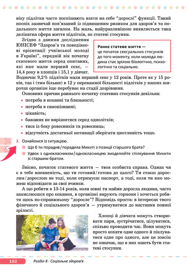 — Прочитайте текст на сторінках 151-152 підручника. Ознайомтеся з інформацією про ранній початок статевого життя й проведеними опитуваннями.