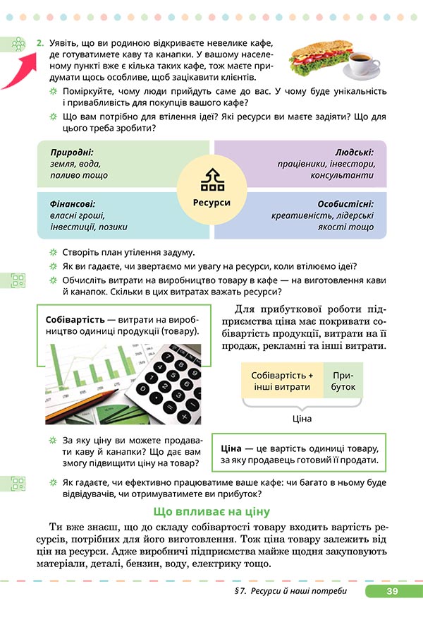 Квест “Власне кафе” (робота онлайн-групами) Попрацюємо разом. У кожного з вас є своя ідея, і якщо ви їх об’єднаєте, отримаєте класний результат. Головне — слухайте одне одного та підтримуйте. Почнімо! Об’єднайтеся в три групи та виконайте завдання 2 на сторінці 39 підручника (див. роздруківку “Розрахунок собівартості кави і канапок”). Ваше завдання — придумати, як залучити клієнтів та зробити ваше кафе популярним та унікальним. ![]() ![]() Обчисліть витрати на виробництво кави й канапок за допомогою таблиці (при обчисленні витрат враховуйте всі використані ресурси). |