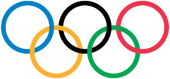 Це олімпійська емблема з п’яти переплетених кілець різного кольору, що символізують п’ять різних частин світу: синій — Європу, чорний — Африку, червоний — Америку, жовтий — Азію, зелений — Океанію (Австралію).