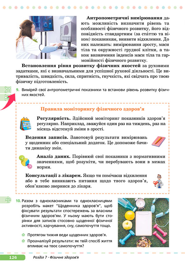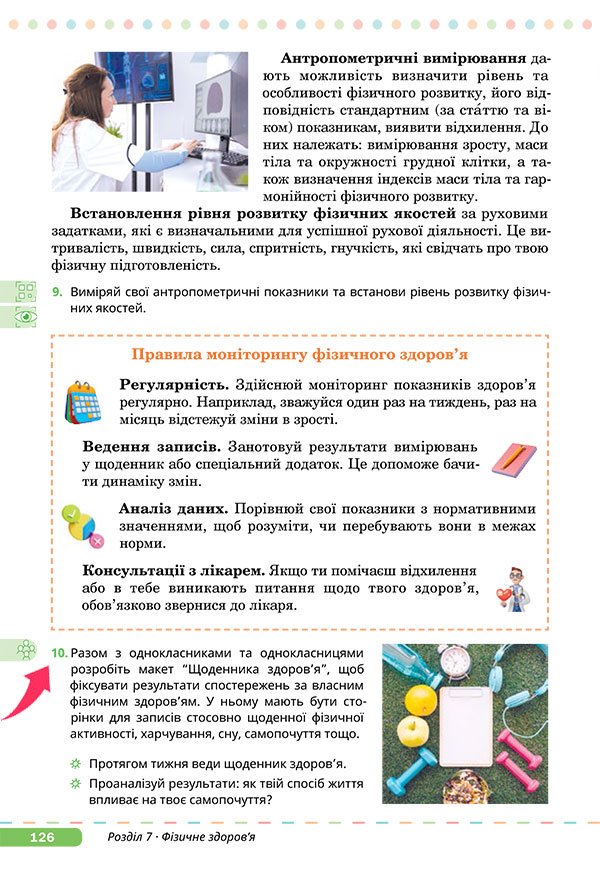 Окремо ми розглянули значення моніторингу фізичного здоров’я. Регулярний самоконтроль, ведення щоденника здоров’я, використання технічних засобів і періодичні медичні обстеження допомагають вчасно виявляти зміни в організмі, оцінювати ефективність оздоровчих заходів і ставити реалістичні цілі для покращення самопочуття.