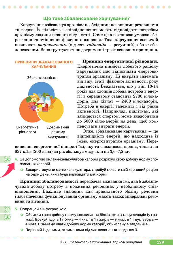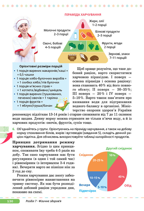 Добовий раціон — це весь обсяг їжі та напоїв, який людина споживає протягом одного дня. Щоб легше зрозуміти, як правильно складати свій раціон, можна скористатися харчовою пірамідою (див. с. 130 підручника).