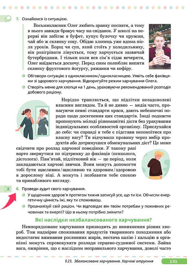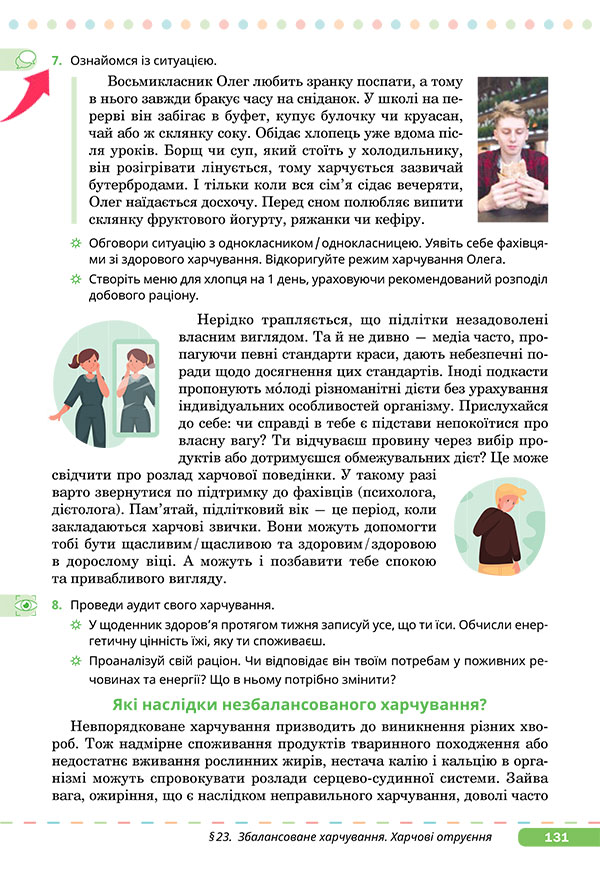 — Виконайте завдання 9 на сторінці 132 підручника. Об’єднайтеся в онлайн-групи й дослідіть одне із захворювань, які виникають через неправильне харчування. Можна вибрати, наприклад, ожиріння, цукровий діабет, гастрит, панкреатит або серцево-судинні захворювання.