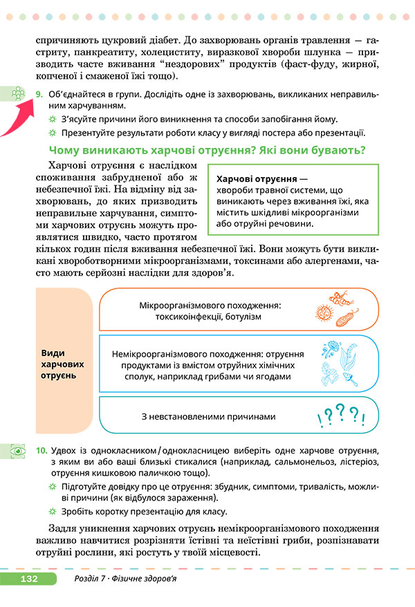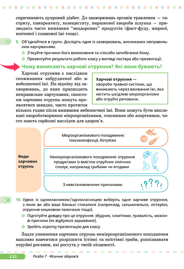 — Виконайте завдання 10 на сторінці 132 підручника. Об’єднайтеся в онлайн-пари. Кожна вибирає одне харчове отруєння, з яким вони або їхні близькі мали справу. Приклади: сальмонельоз, лістеріоз, отруєння кишковою паличкою, отруєння грибами чи токсичними рослинами.