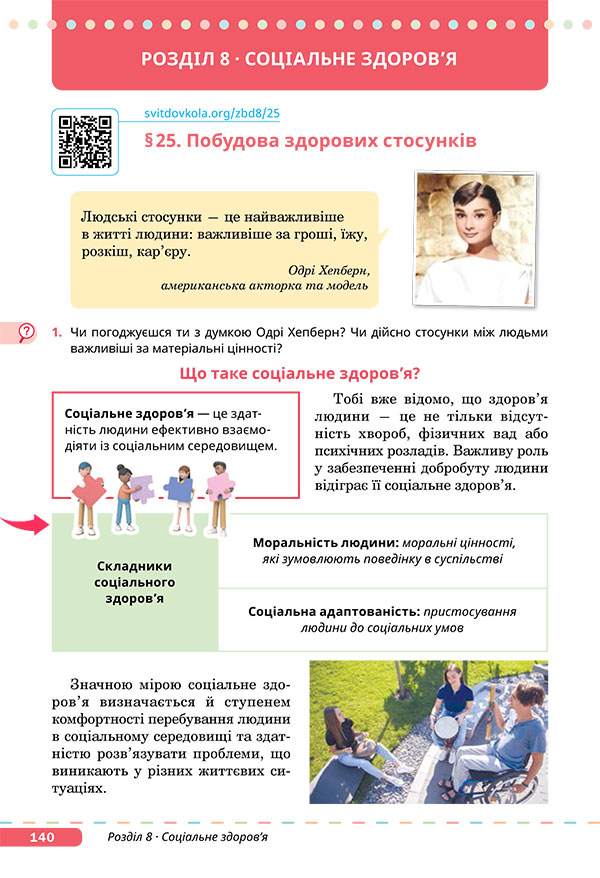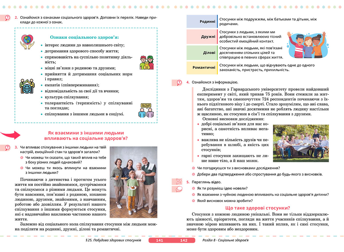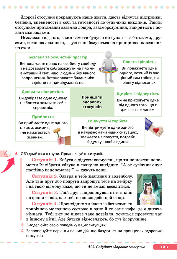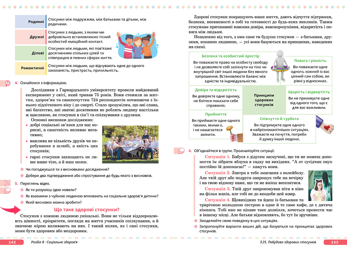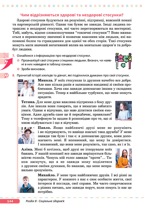 — Як думаєте, чи важливо будувати стосунки з оточенням? Що для вас означають здорові стосунки з людьми? Прочитайте текст на сторінках 142-143 підручника.