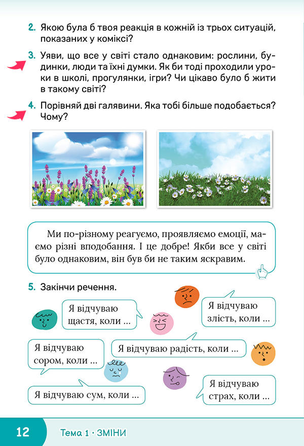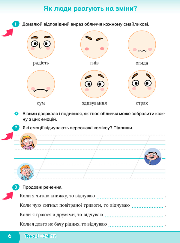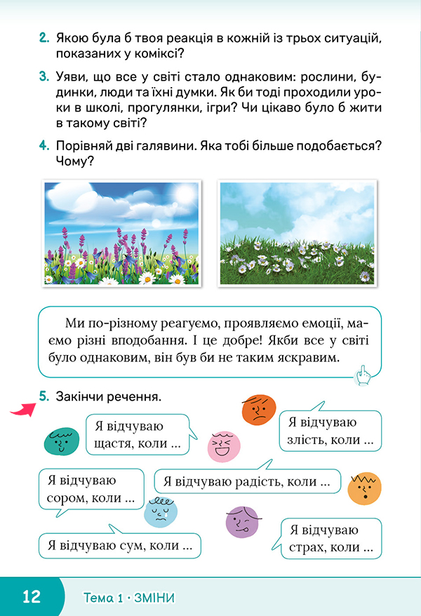 Уявіть, якою була б ваша реакція у кожній із трьох ситуацій коміксу? Виконайте завдання 3–4 на с. 12 підручника. ![]() ![]() |