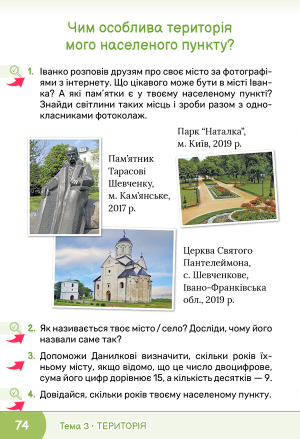 Розгорніть підручник на с. 74 і виконайте завдання 1, 2, 3, 4. ![]() ![]() Пригадайте або розпитайте дорослих, які пам’ятки є у вашому населеному пункті. |