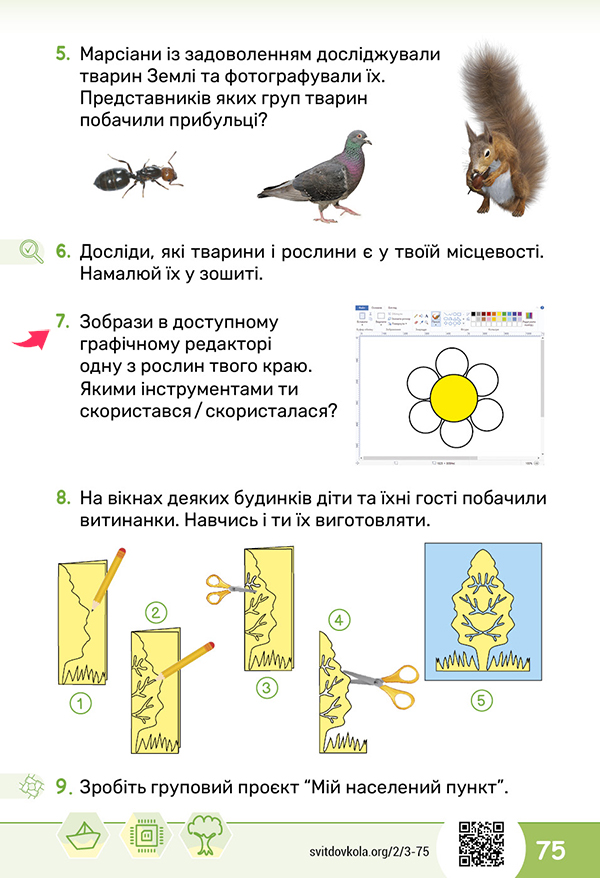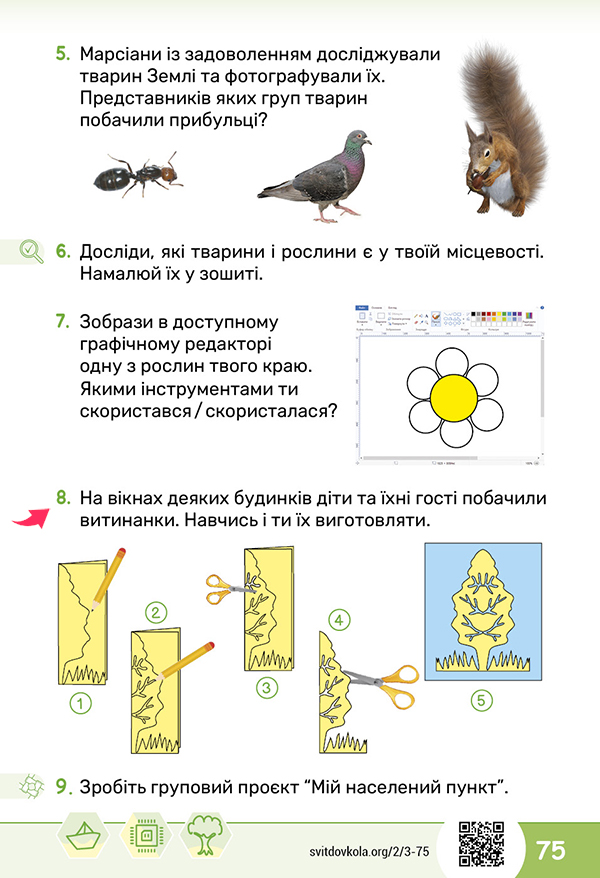 Розгорніть підручник на с. 75 і виконайте завдання 8. Можете зробити іншу витинанку — подивіться на ці зразки. Поміркуйте, як такі грибочки та листочки можна зробити методом витинання. ![]() ![]() |
