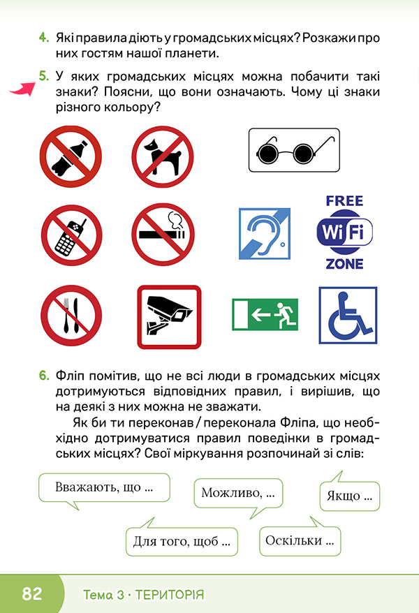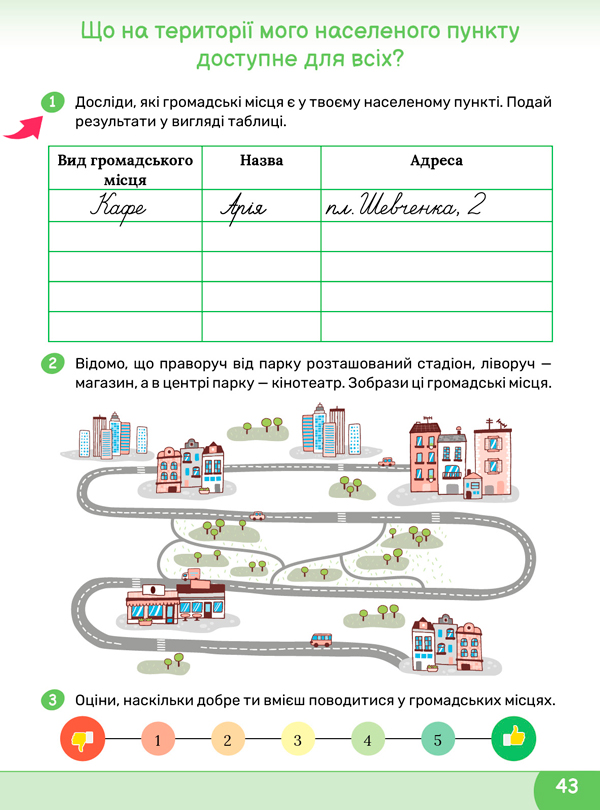 Можете скористатися підказками — назвіть свій населений пункт, цікаві місця. Розкажіть, в яке місце ви часто ходите разом з рідними та знайомими. Більше розкажіть про своє улюблене місце та для чого потрібні громадські місця. Розповідь можна записати на відео і показати рідним, однокласникам і вчителю. |