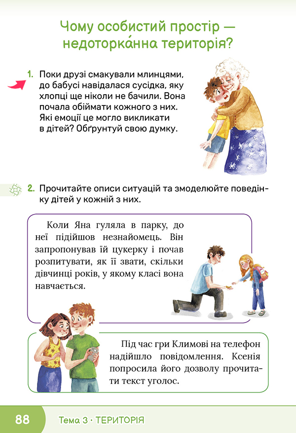 Прочитайте описи ситуацій у завданні 2 на с. 88 підручника та змоделюйте поведінку дітей у кожній з них. Ситуація 1. Коли Яна гуляла в парку, до неї підійшов незнайомець, запропонував їй цукерку і почав розпитувати, як її звати, скільки дівчинці років, у якому класі вона навчається. Не можна приймати частувань від незнайомців. Ситуація 2. Під час гри Климові на телефон надійшло повідомлення. Ксюша попросила дозволу прочитати текст уголос. Не можна без дозволу людини читати або показувати іншим її повідомлення. |