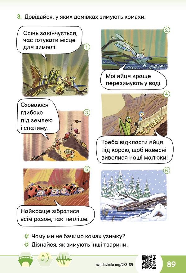 Розгорніть підручник на с. 89, уважно розгляньте й озвучте комікс. Поміркуйте, чи є у комах особистий простір. Який він? ![]() ![]() Запитання