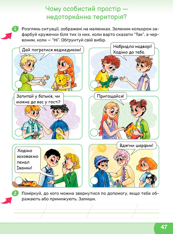 Якщо дотики не є небезпечними, але вони неприємні для вас, ви завжди маєте право сказати “ні”. Це не буде неввічливо. Пам’ятайте: ваше тіло належить тільки вам! |