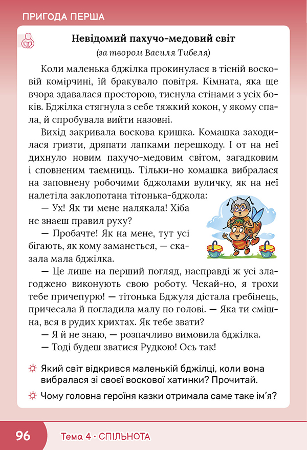 У пригоді на с. 96 підручника знайдіть і виразно прочитайте діалог тітоньки Бджулі та Рудки |