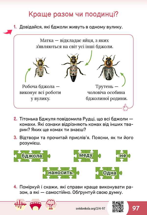 Сьогодні ми повторимо, що відрізняє комах від інших тварин, та дослідимо, як живе бджолина спільнота. Обговоримо, коли можна діяти самостійно, а коли — разом. ![]() |