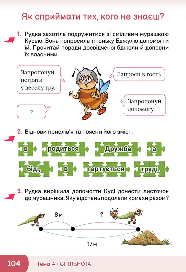 До 2-В класу прийшла нова учениця — Діана. Ось вчителька представила її новим однокласницям та однокласникам, ось минув перший урок — почалася перерва. Оберіть слова, які допоможуть дітям налагодити дружні стосунки з Діаною. Додайте власні приклади. — Привіт! Як тобі перший день у нашому класі? — Діана! Діана! Діана — барабана! — Дивись, які в мене кросівки! В тебе таких нема! — Знайомся, це Сашко. Він трохи пришеле́пкуватий. Не дружи з ним. — Хочеш, ми покажемо тобі, де їдальня та спортзал? А після уроків можемо погратися разом у дворі школи! — Мені дуже подобається твоя зачіска! — Подивіться, який у неї ніс! Як у сороки! — Ти мені не подобаєшся, бо ти схожа на мою сусідку, вона погана. Перш ніж щось сказати, уявляйте, що ті самі слова інші кажуть вам, і міркуйте, що ви відчуватимете. Ніколи не кажіть і не робіть іншим того, чого не хочете, щоб робили і казали вам. ![]()