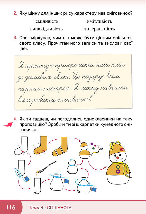 Виконайте завдання 4 на с. 116 підручника. Зробіть зі шкарпетки кумедного сніговичка. ![]() ![]() |