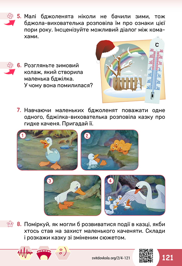 Розгорніть підручник на с. 121. Розгляньте кадри мультфільму про гидке каченя. Пригадайте і розкажіть цю казку. ![]() ![]()