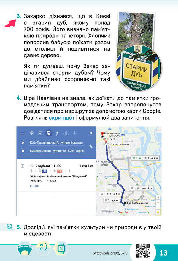 Розгорни підручник на с. 13 і прочитай завдання 3. ![]() ![]() Розглянь фото старого дуба, який росте в Києві. Цим деревом зацікавився Захар.