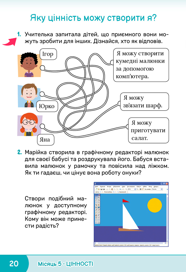 Гра “Лабіринт”. Розгорни підручник на с. 20. Виконай завдання 1. Учителька запитала дітей, що приємного вони можуть зробити для інших? Дізнайся, хто як відповів. ![]() ![]() |