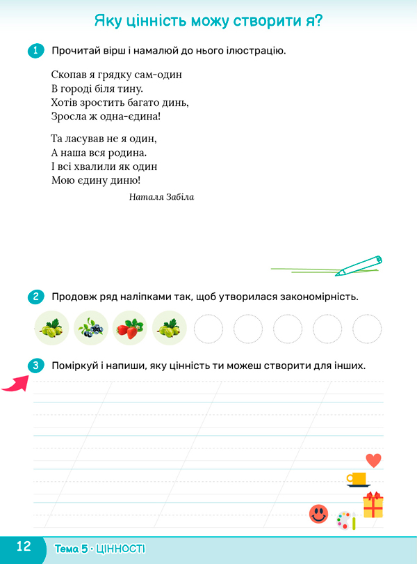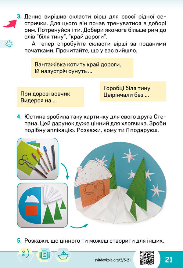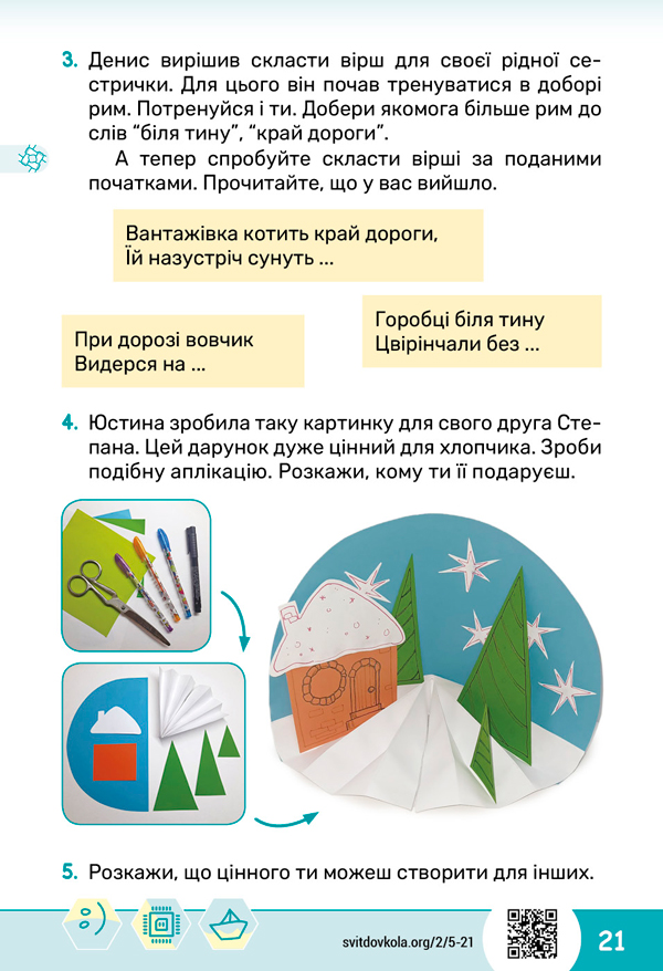 Коротко напиши про це в зошиті на с. 12 (завдання 3). ![]() ![]() Поділися своїми міркуваннями з однокласниками / однокласницями. Зателефонуй їм і прочитай свої записи. Послухай, що вони можуть створити для інших.