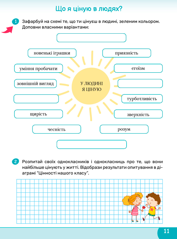 А що ти цінуєш в людях понад усе? Виконай завдання 1 на с. 11 у зошиті. ![]() ![]() Зафарбуй на схемі те, що ти цінуєш в людині, зеленим кольором. Доповни власними варіантами. Можеш використати хмару слів. ![]() |