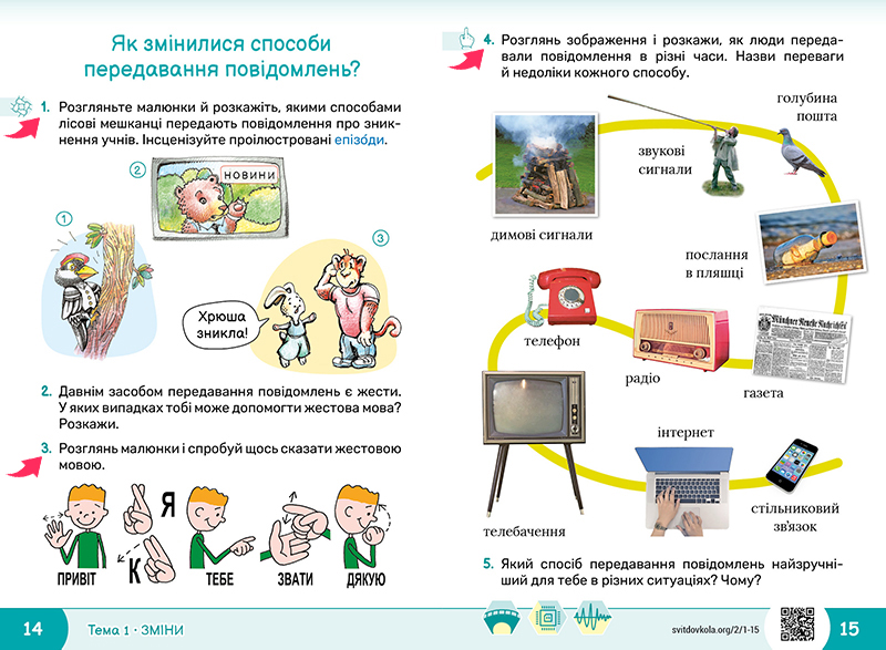Виконайте завдання 1, 3, 4 на с. 14-15 підручника. ![]() ![]() Як жестами можна розповісти про іграшки Як змінювалися телефони |