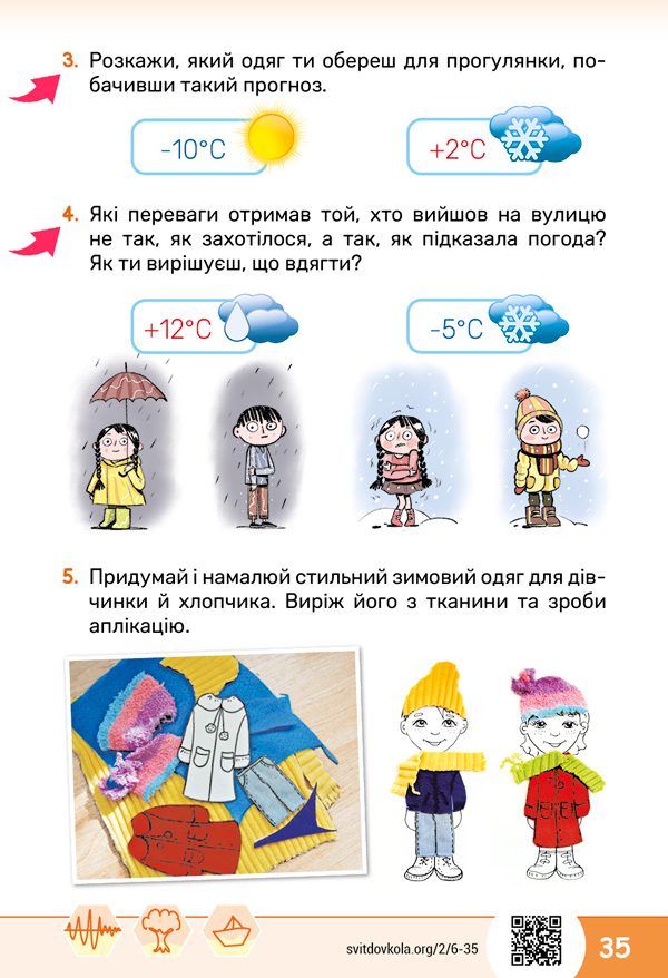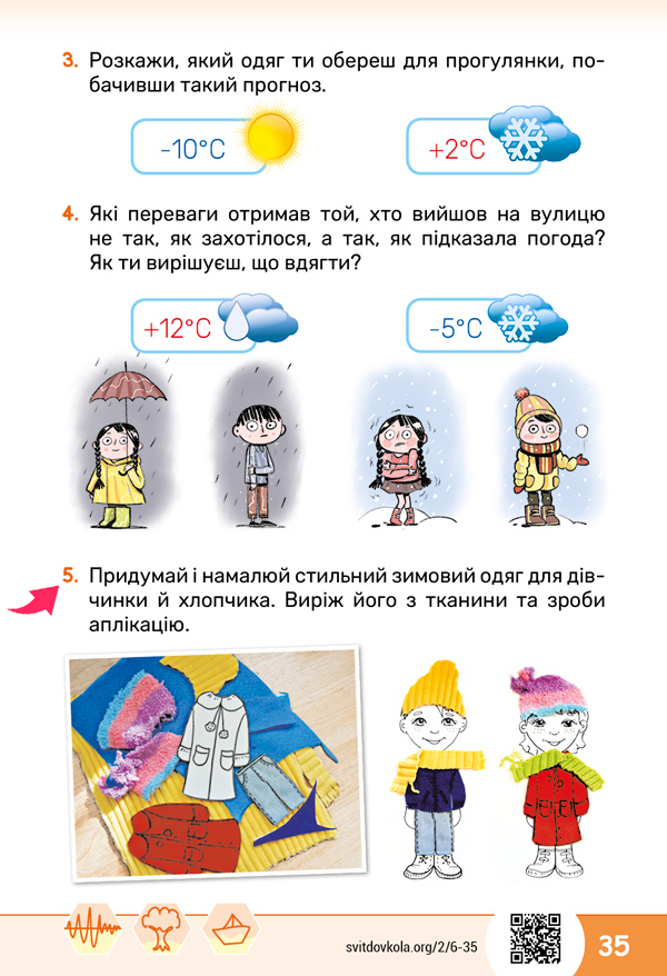 Роздивись ілюстрацію до завдання 5 на с. 35 підручника. Уяви себе модельером / модельєркою. Вигадай і намалюй стильний зимовий одяг для дівчинки і хлопчика. Зроби аплікацію. ![]() ![]() |