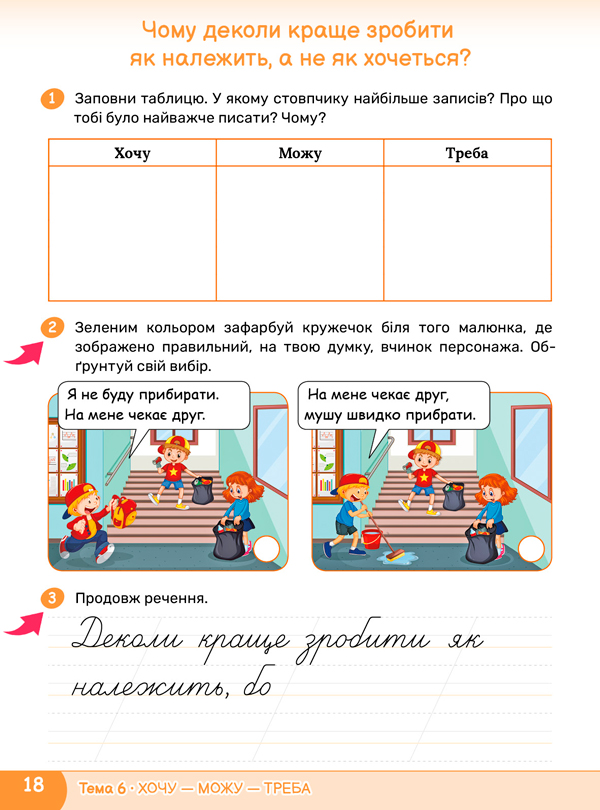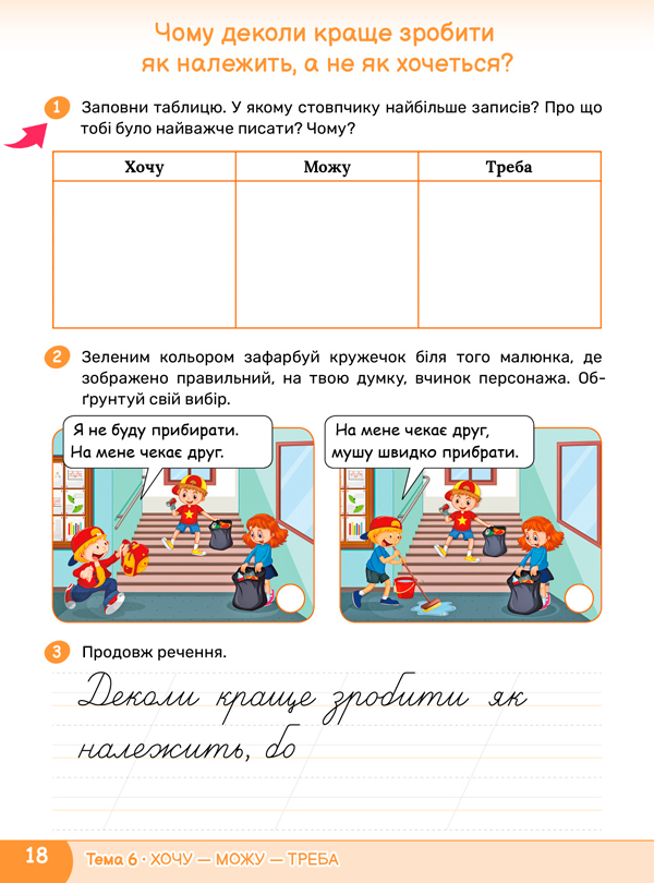 Висновок. Якщо не хочеш, але все-таки робиш те, що треба, то не лише розрізняєш “хочу”, “можу” і “мушу”, а ще й умієш контролювати свої дії — керувати собою. |
