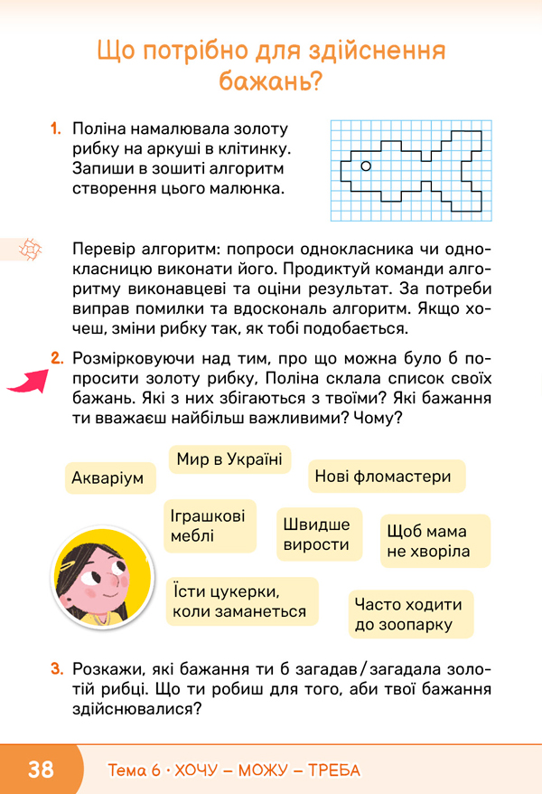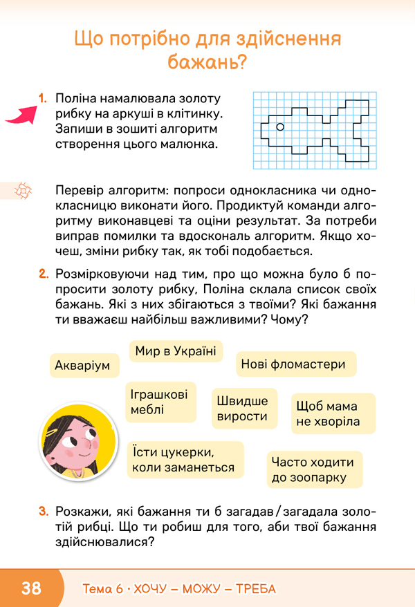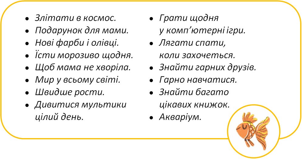 А якби ви мали золоту рибку, то які три бажання загадали б? Прочитайте перелік бажань. Оберіть із них тільки 3 і запишіть біля рибки, яку намалювали, коли перевіряли свій алгоритм. Обґрунтуйте свій вибір. ![]() Підкресліть те, яке для вас найважливіше серед трьох обраних. Чому саме це? |