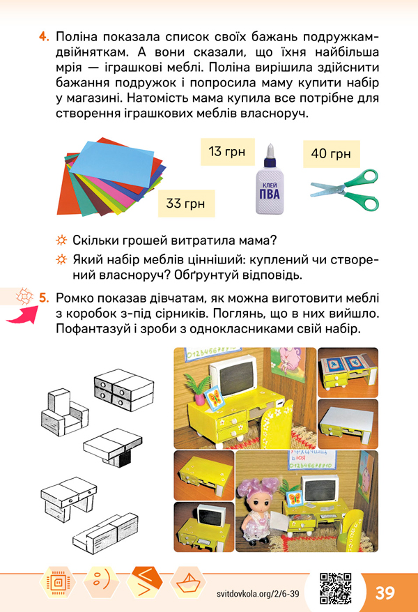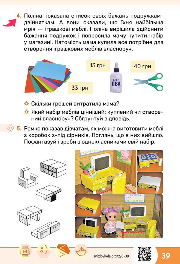 Ромко показав дівчатам, як можна виготовити меблі з коробок з-під сірників. Погляньте, що в них вийшло (підручник, с. 39, завдання 5). Пофантазуйте і зробіть свій набір іграшкових меблів. ![]() ![]() |