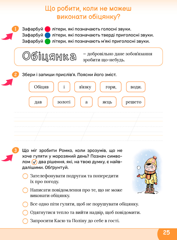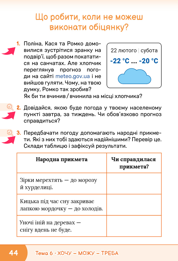 Уявіть: ви позичили книжку в однокласника. Але він сам позичив її в бібліотеці, і до понеділка має повернути. Ви пообіцяли принести книжку в понеділок, але у п’ятницю ввечері дізналися, що не зможете прийти до школи. Номера телефону однокласника у вас немає. Що краще зробити? ![]() ![]() ![]() Інколи виникають обставини, що не залежать від вас, і виконати обіцянку стає складно, або й зовсім неможливо. Якщо складно — сміливо звертайтеся по допомогу: так ви покажете, що ви вже дорослі і відповідальні. Якщо ж виконати обіцянку геть не можна, обов’язково попередьте про це. |