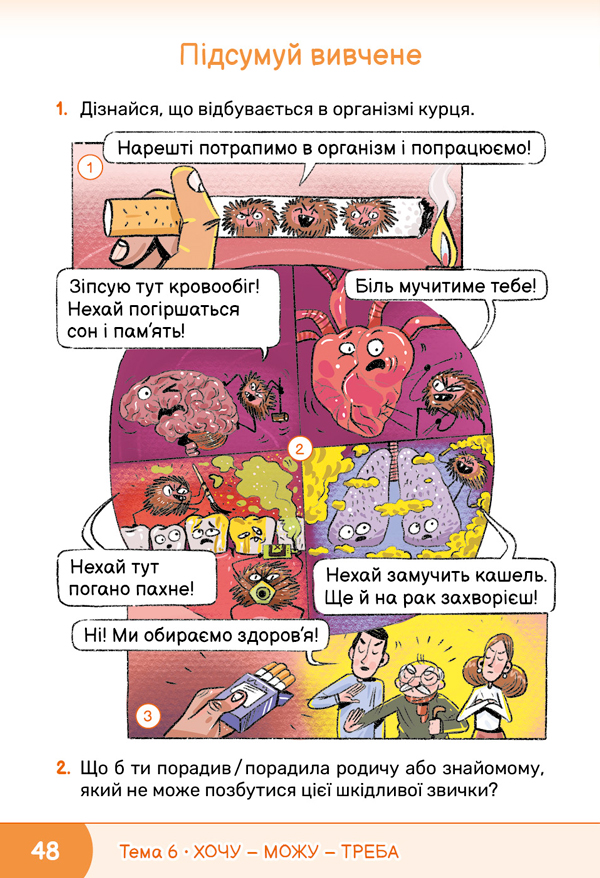 Прочитай комікс на сторінці 48 підручника і довідайся, що відбувається з організмом людини, яка палить.