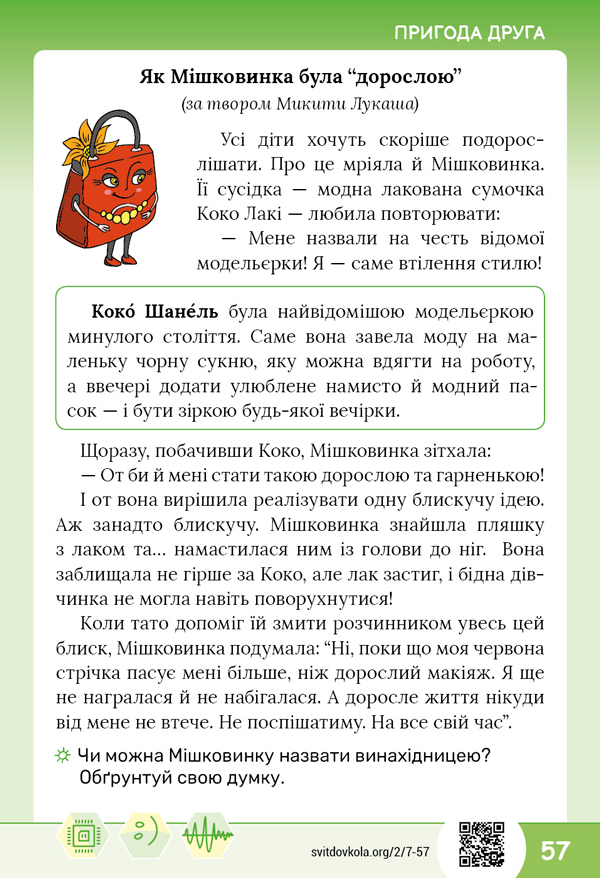 Сьогодні ми прочитаємо другу пригоду Мішковинки, дізнаємося, хто така Коко Шанель та познайомимося з її батьківщиною. А ще ми спробуємо себе у ролі стилістів і потренуємося розшифровувати знаки на бірках одягу. |