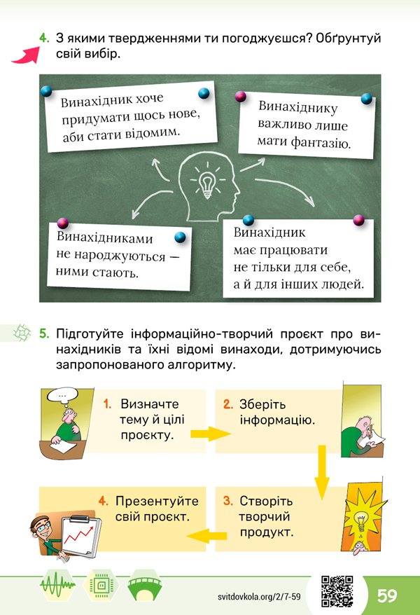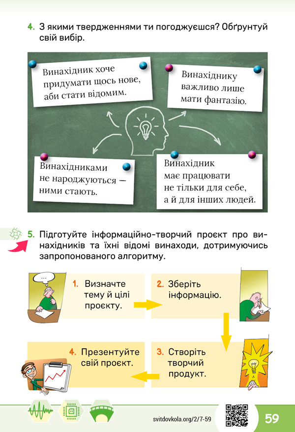Вдома підготуйте інформаційно-творчий проєкт про винахідників та їхні відомі винаходи, дотримуючись алгоритму на с. 59 підручника. ![]() ![]() ![]() |
