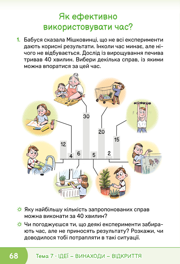 На запитання: “Яку найбільшу кількість справ можна виконати за 40 хвилин?” діти дали різні відповіді. Подивіться, які саме. Володя відповів так: ![]() Оленка дала таку відповідь: ![]()