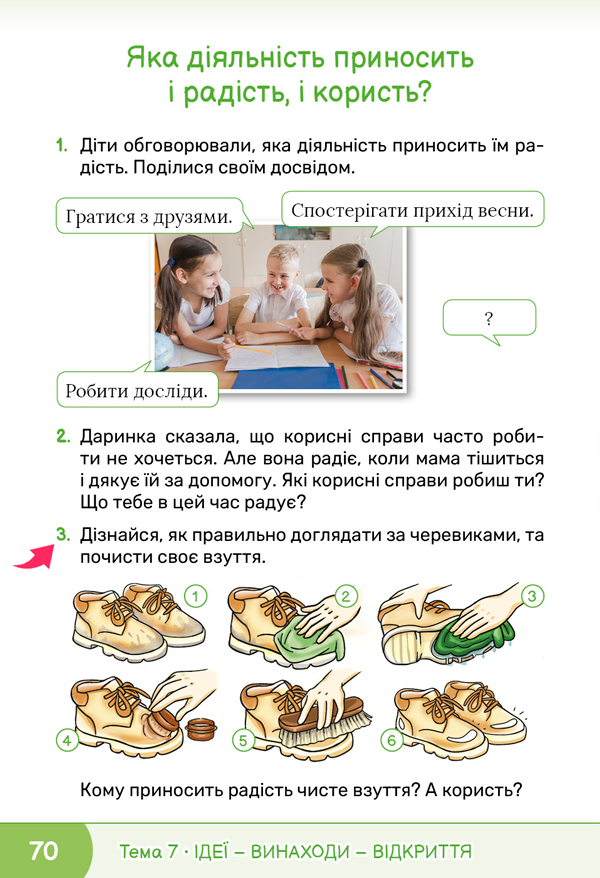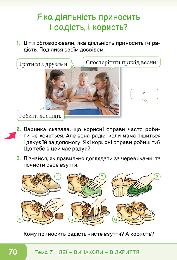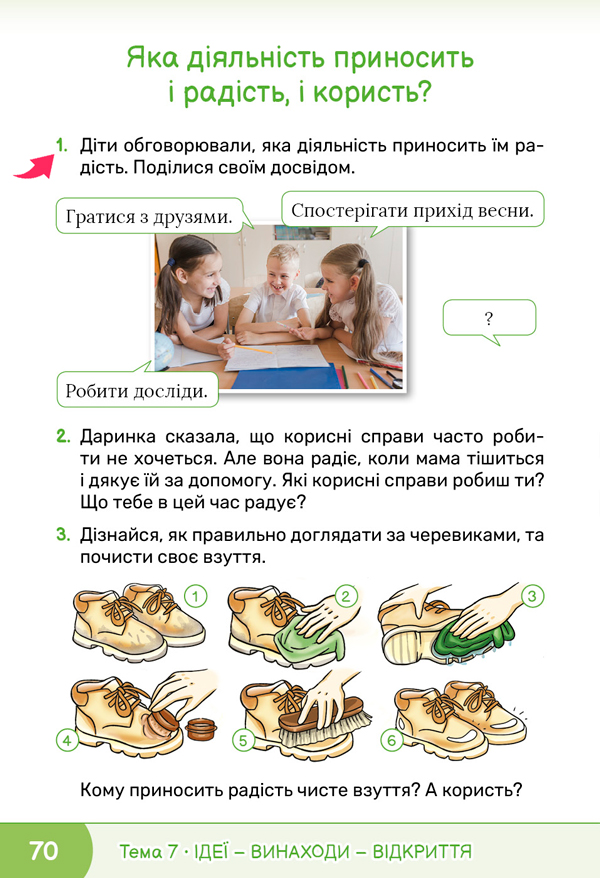 Виконайте завдання 1 на сторінці 70 підручника. Діти обговорювали, яка діяльність приносить їм радість. Доповніть їх ідеї власними. ![]() ![]() |