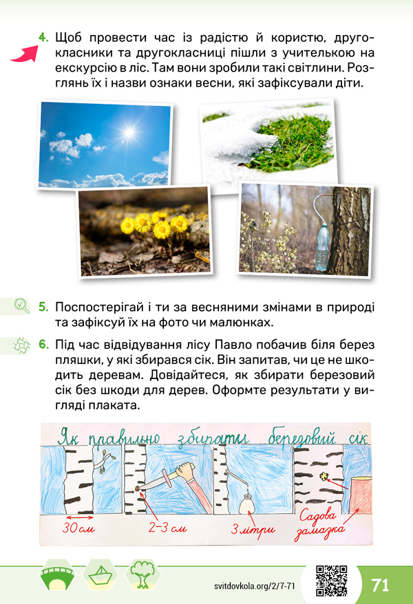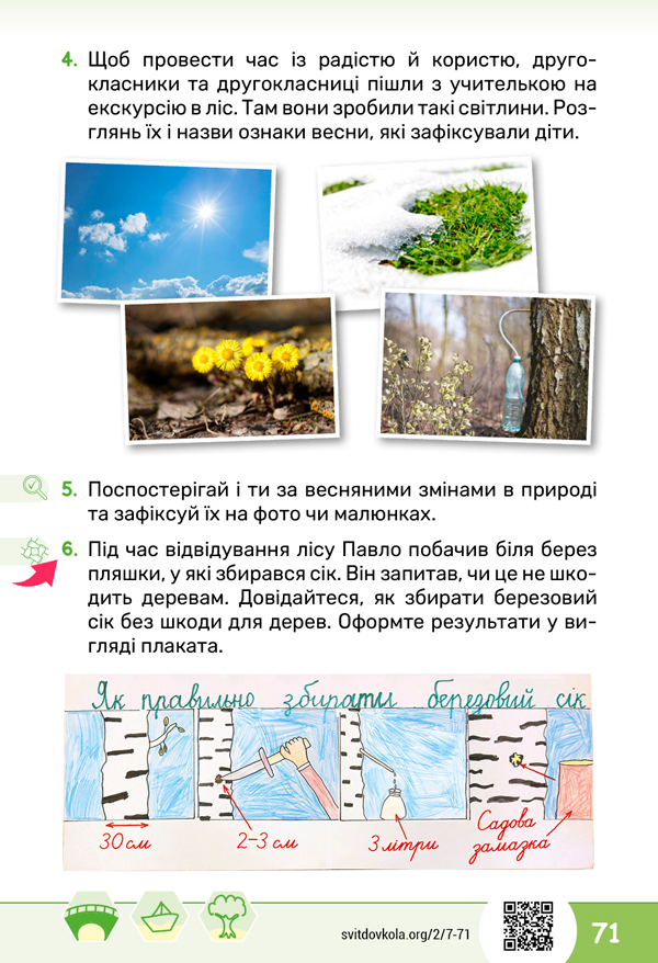 Виконайте завдання 6 на сторінці 71 підручника. Створіть плакат, який розповідає як правильно збирати березовий сік. ![]() ![]()