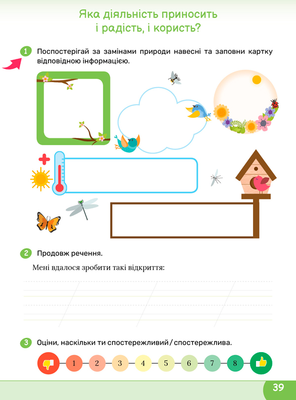 Виконайте завдання 1 на сторінці 39 робочого зошита. Заповніть картку спостережень за природою. ![]() ![]() |