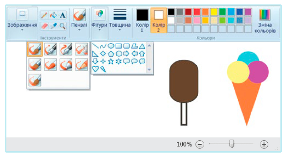 Катруся намалювала в графічному редакторі Paint морозиво. Обведи на панелі інструменти, які використала дівчинка (зошит для діагностувальних робіт, с. 36, завдання 6). ![]() |
