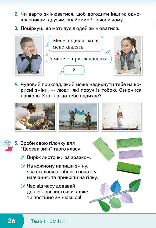 Поміркуйте до яких змін ви прагнете. Виконайте завдання 5 на с. 26 підручника та створіть “Дерево змін”. ![]() ![]() |