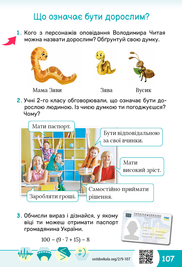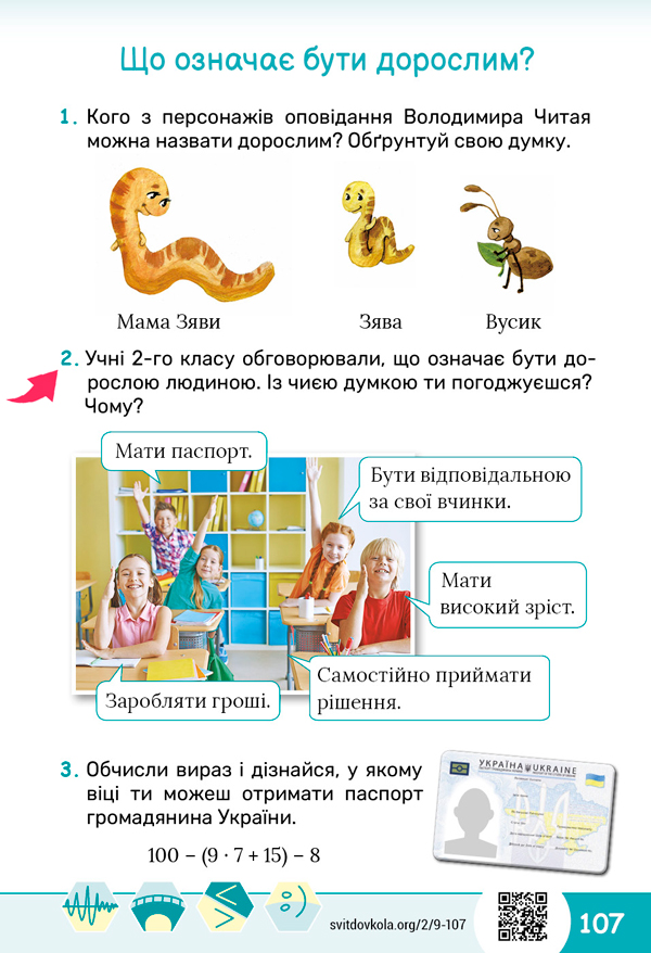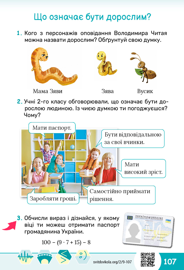 У певному віці кожен громадянин України отримує паспорт. Чи знаєте, скільки вам буде років, коли отримаєте паспорт? Перевірте здогадку, виконавши завдання 3 у підручнику на сторінці 107. ![]() ![]() |